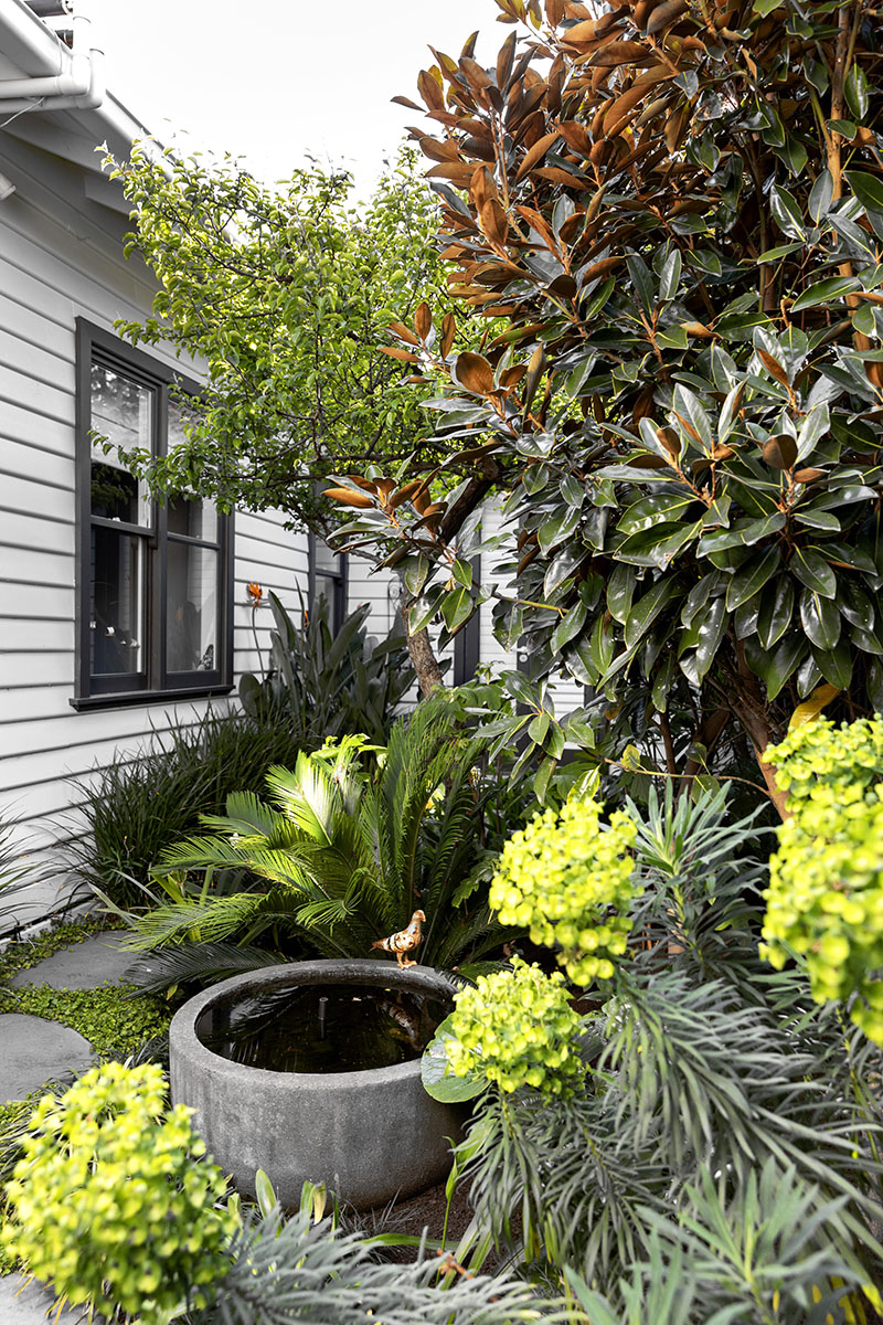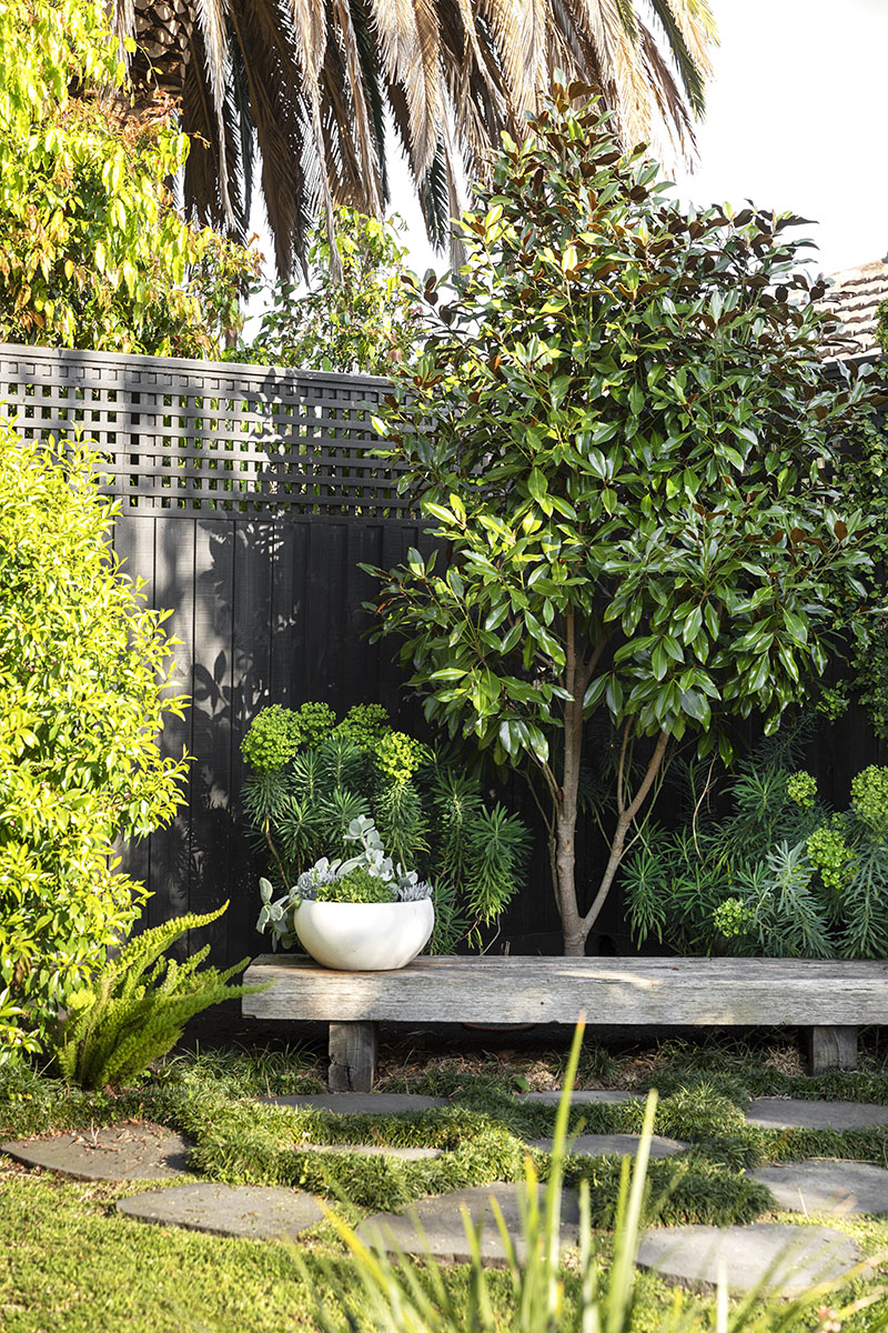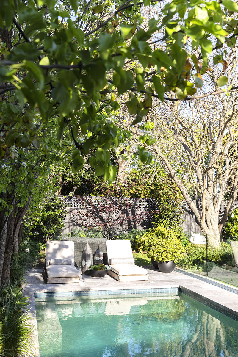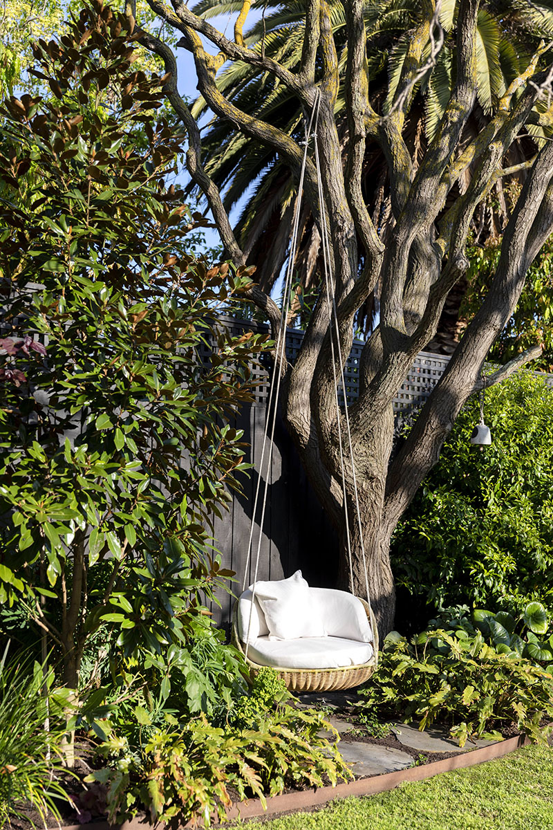 This Bayside Melbourne garden design is inspired by the stunning Jacaranda canopies, which create a cathedral-like ambience across the rear garden. The design blends soft, flowing planting with elegant features, including a Mediterranean-inspired pool, a Dedon hanging chair, succulent displays, and a tranquil courtyard with a water feature. Grey limestone paving, timber decking, and a rustic wharf timber bench enhance the relaxed coastal aesthetic, creating a serene retreat for the family to relax, entertain, and enjoy.